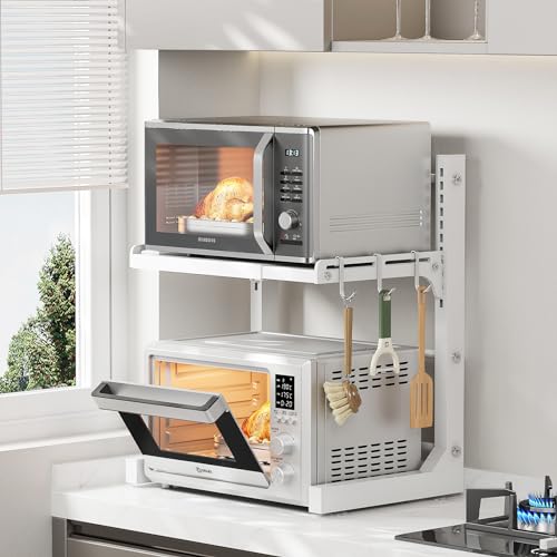 ABCOOL Infällbar justerbar 2 axiella kök bagare mikrovågsugn ställ, 2 nivåer expanderbar och justerbar höjd kolstål hylla bänk med 3 klämkrokar, elektrisk ugnshållare