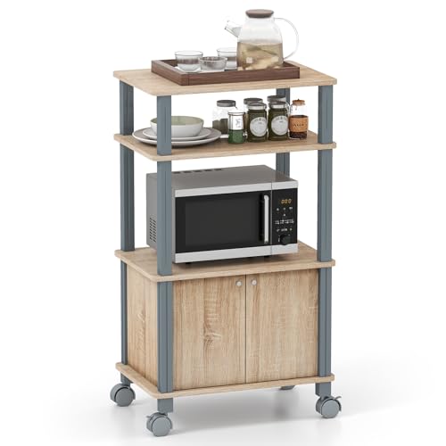 COSTWAY Kökshylla med hjul, köksvagn med hyllor och skåp, stående hylla för kök, matsal, serveringsvagn för mikrovågsugn, mikrovågsugn, sidovagn rullvagn, 60 x 40 x 98 cm (natur)