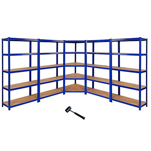 T-RAX 5 x Robust Blå Garagehylla Hyllenhet Verkstadshylla Verkstad Lager Lagerhylla Garage Förvaring MDF Bultfri Bultlös Gummifötter Pulverlackerat Stål 180 cm / 1800 mm 90 cm / 900 mm 45 cm / 450 mm