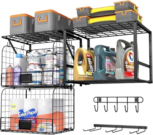 Qustikuri 3-pack garage hyllor tung plikt garage lagring med trådkorgar tvättstuga hyllor vägghyllor med krokar verktyg organisatör för skjul trädgård kök organisering och förvaring