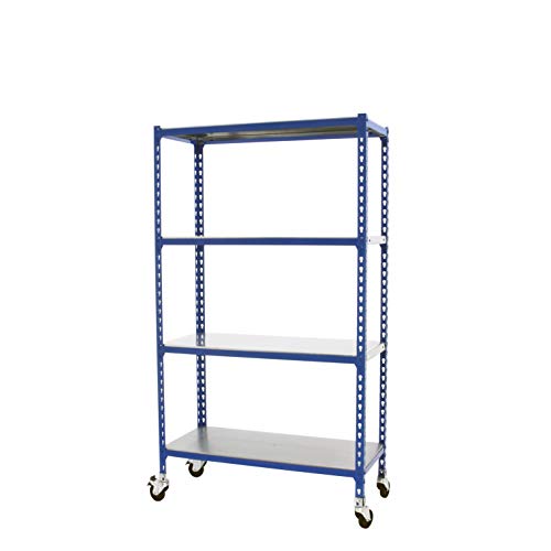 Simon Rack Förvaringshylla med Hjul, 4 Hyllplan, 1575x800x400 mm – Garagehylla i Blå/Galvaniserad, 75 kg Belastning per Hyllplan - B40