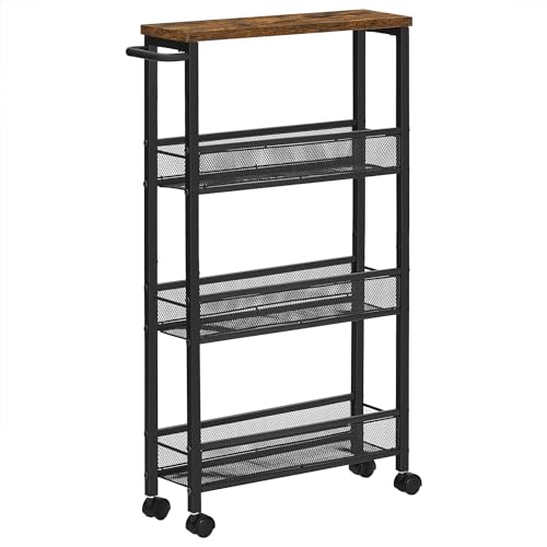VASAGLE vagn med 4 hyllplan, platsbesparande köksvagn med hjul, stålram, handtag, vagn för små utrymmen, Kök Badrum Vardagsrum Studio, Rustik brun och svart LRC032B01V1