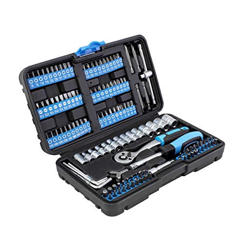 DURATECH Hylsnyckelsats 108 delar, spärrlåda vridmomentnyckel set med 1/2 tum och 1/4 tum omkopplingsknapp, förlängningar, bits, uttag, kromvanadinstål, inkl. fodral