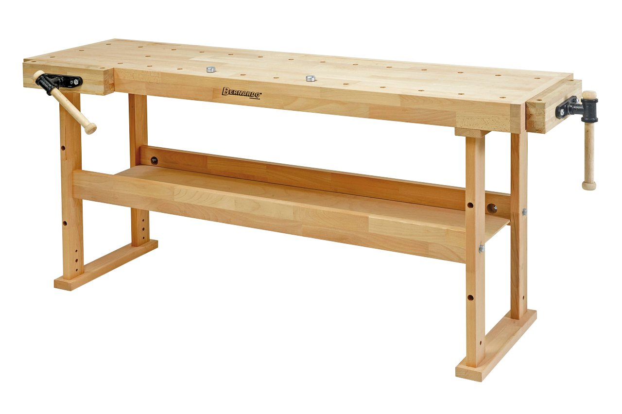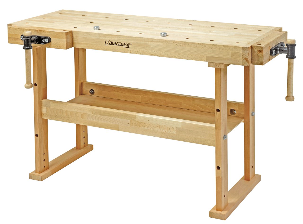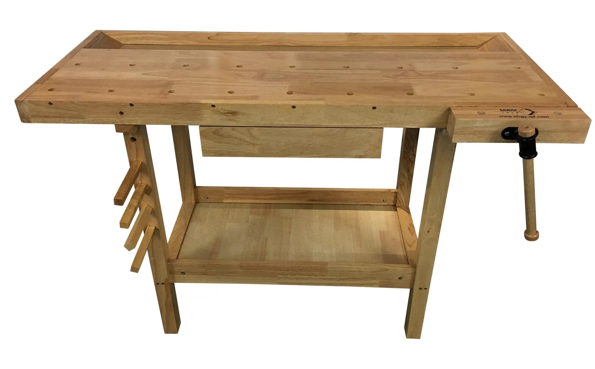 Hyvelbänk 145x49x86cm i trä (Gummiträ) med Förvaringslåda, Underhylla, Skruvstäd och Bänkkrokar brun