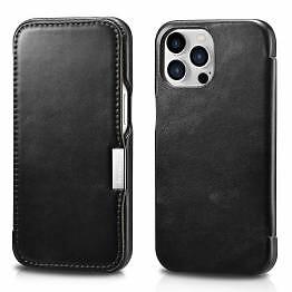 iCarer iPhone Metal 13 Clip Vintage Folio handgjort Bookcase i skal äkta läder fodral Svart för Pro (RIX1307-BK)
