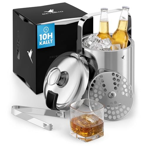 Beyond Ishållare med Lock & Tång i Rostfritt Stål BPA-fri - Dubbelväggig Iskylare 1,3 Liter Isbitar, Ishink, Iskylare, Isbitsbehållare, Ice Cube Bucket Kylare - Silver