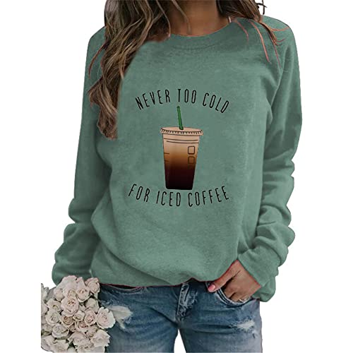Women Crewneck Coffee Graphic Sweatshirts Never Too Cold For Iced Coffee Shirts Long Sleeve Loose Pullover Tops