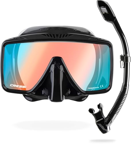 CRESSI since 1946 - SF1 & Dry Combo - Frameless Square Mask Set with Tempered Lens + Dry Snorkel ideal for Freediving and Snorkelling, Black/380 UV Blue Orange Glass, One Size Unisex