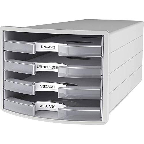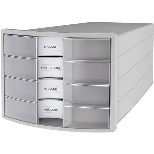 HAN Lådlåda IMPULS 2.0 med 4 öppna lådor för DIN A4/C4 inklusive etikettskyltar, utdragslås, möbelvänliga gummifötter, premiumkvalitet, 1013-63, ljusgrå/genomskinlig