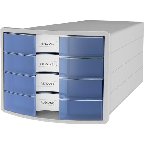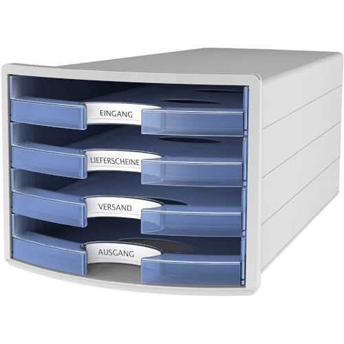 HAN Lådlåda IMPULS 2.0 med 4 öppna lådor för DIN A4/C4 inklusive etikettskyltar, utdragslås, möbelvänliga gummifötter, premiumkvalitet, 1013–64, ljusgrå/genomskinlig blå