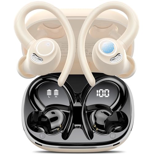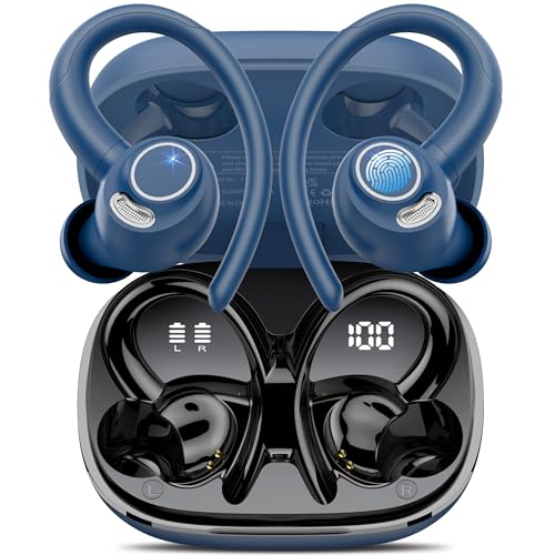 Jesebang Bluetooth-hörlurar sport, in-ear hörlurar trådlösa Bluetooth 5.3 med HD Mic, enastående ljud, dubbel LED-skärm, 40 timmars speltid, komfort passform, IP7 vattentäta hörlurar med öronkrokar