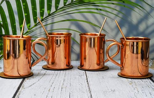 Moskva Mule Mule Mule Set | Cocktailglas i ren koppar | Set med 4 stycken med slät finish, 4 underlägg och 4 gratis sugrör