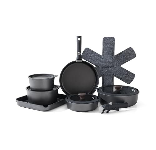 SENSARTE Nonstick Kastrullset för Induktion 17-delar, Stekpanna med Lock, Sauterpanna med Avtagbart Handtag, Kastrull och Grillpanna, Ugnssäker, Lämplig för Alla Spisar, PFOA-fri (svart)