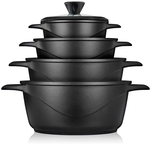 Briebe kastrullset för induktion, 8 stycken, set med 4 krukor av gjuten aluminium, non-stick-beläggning ILAG GRANITEC utan PFOA, set med glaslock, silikonhandskar, glaskeramik, gas, MGK-12S
