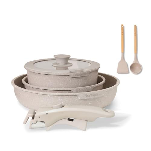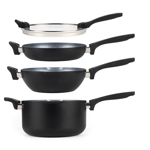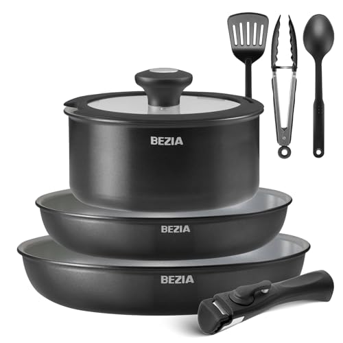 BEZIA Keramikpanna med avtagbart handtag – 9 delar kastrullset induktion, non-stick panneset med lock, kastrullset för alla typer av spisar, stapelbara grytor, ugnssäkra och diskmaskinssäkra