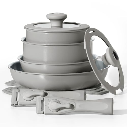 Bezia 17-delat grytset med avtagbart handtag, keramisk non-stick belagd, induktion kastrullset för alla spisar, stapelbar camping köksredskapsset