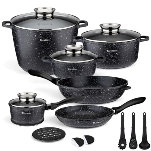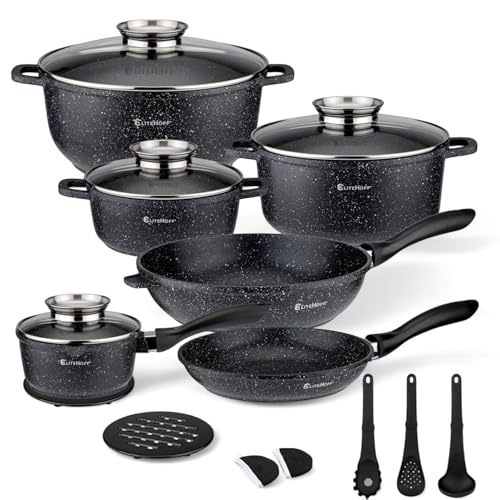 EliteHoff Induktion kastrullset, 17-delat köksredskapsset, kastrull och pannset med lock, kastrull i aluminium, non-stick köksredskap för alla typer av spisar, diskmaskinssäker och PFOA-fri (svart, E