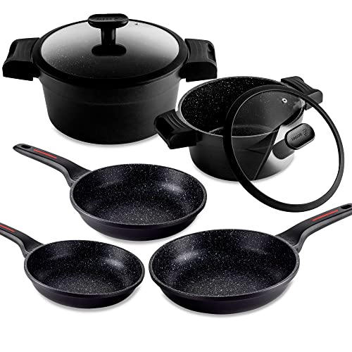 MÄSER 931727 serien Izar, kastrullset med premium non-stick-beläggning, lämplig för induktion, innehåller 2 kastruller med lock, 1 stekpanna, 1 gryta, aluminium, svart