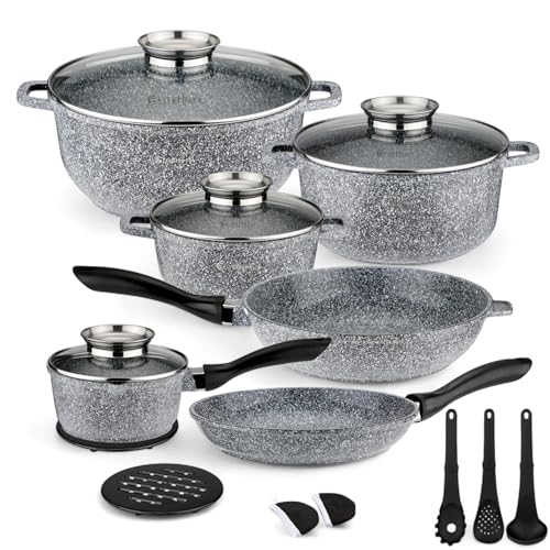 EliteHoff Induktion kastrullset, 17-delat köksredskapsset, kastrull och stekpanneset med lock, kastrull aluminium, non-stick köksredskap för alla typer av spisar, diskmaskinssäker och PFOA-fri (grå, E