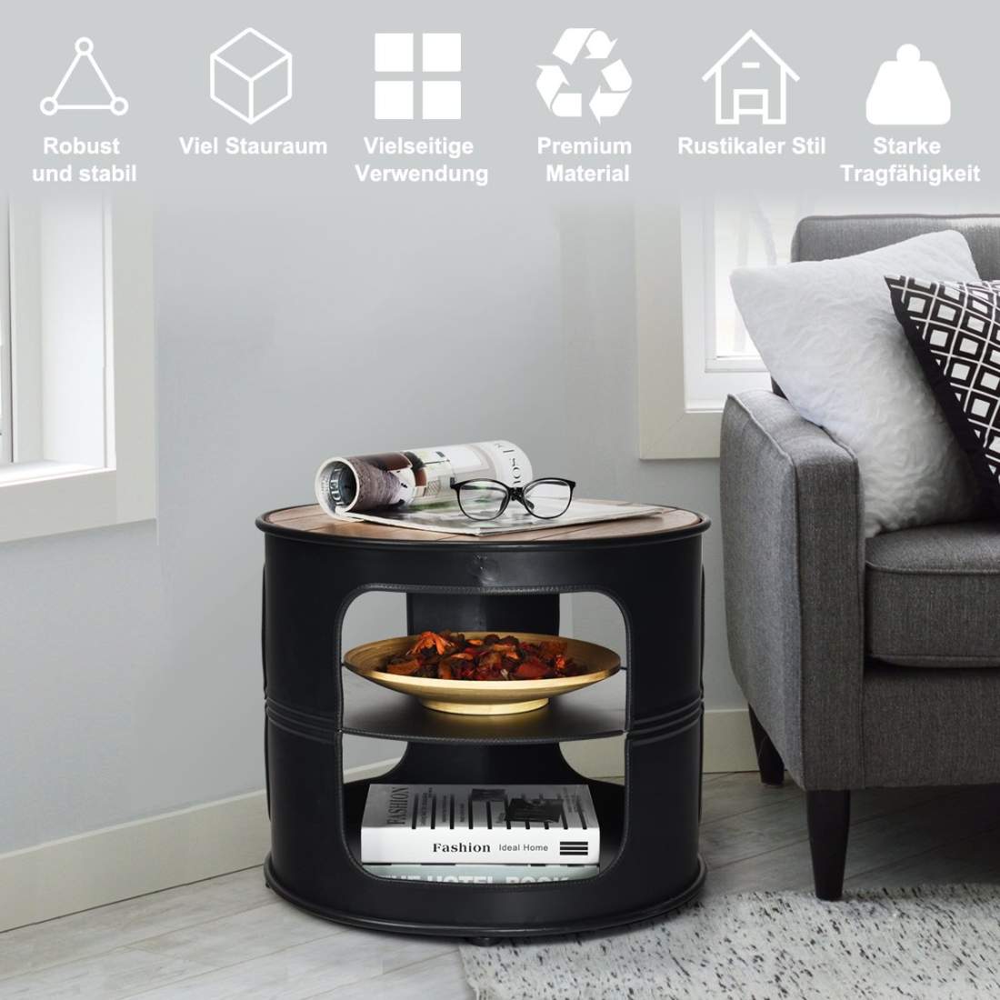 Industriellt soffbord av trä och metall med 2 hyllplan, lastkapacitet upp till 50 kg, svart