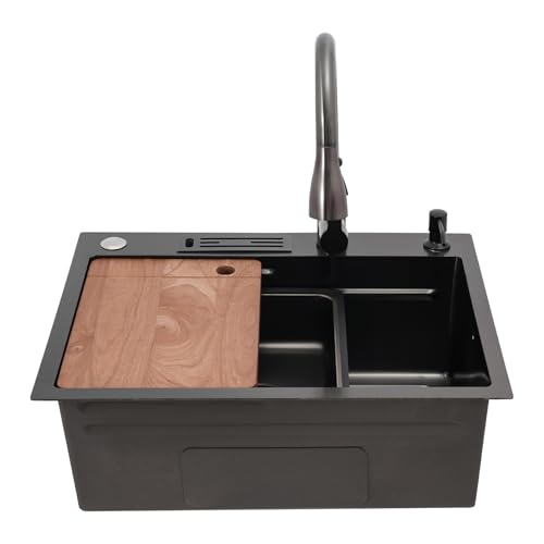 Diskbänk 60 x 45 cm, infälld diskbänk i rostfritt stål med kran, skärbräda, tvåldispenser och knivhållare, svart diskho för restauranger, barer, hotell