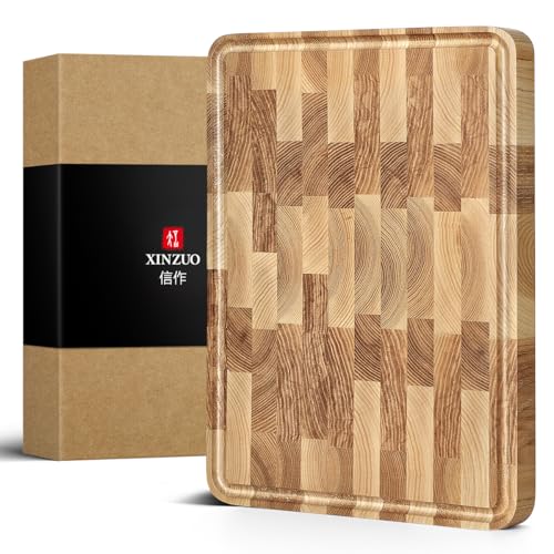 XINZUO Ask i skärbräda (30,5 x 20,5 x 2,5 cm) - professionellt och hushålls träbricka för skärning och servering med halkfria fötter, juicespår och infällt handtag