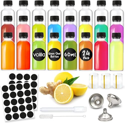 volila Wellness Shot Flaskor - 24 Pack Ingefära Shot Flaskor med Lock 60 ml - Läckagesäkra Glasflaskor med Lock som Juicflaskor, Kylskåpsflaskor, Andra - Tratt, Etikett och Krympfilm ingår