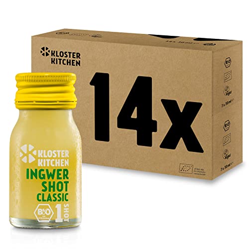 Kloster Kitchen Ingefära Shot 1SHOT 14 x 30 ml med riktiga ingefära bitar I Bio ingefära shot vegansk i To Go glasflaska I Ingefärashot söt utan tillsatser och med naturlig söt