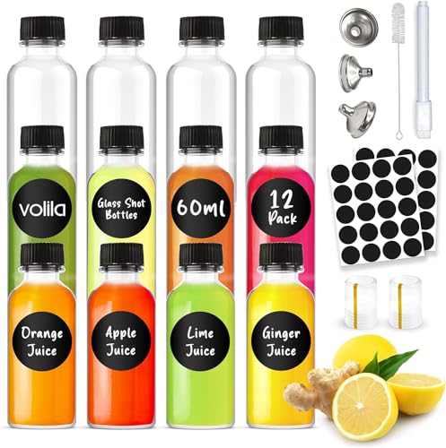 volila Wellness Shot Flaskor - 12 Pack Ingefära Shot Flaskor med Lock 60 ml - Läckagesäkra Glasflaskor med Lock som Juicflaskor, Kylskåpsflaskor, Andra - Tratt, Etikett och Krympfilm ingår