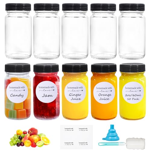 Amentalove 10 st ingefära shot, glasflaskor med lock, 60 ml juice shotflaskor med etiketter, små glasflaskor, återanvändbara mini ingefärsflaskor med bred mun, glasflaskor för oljor, sås, mjölk