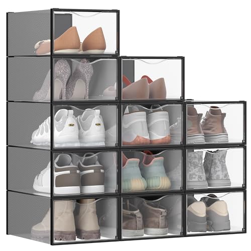 SONGMICS Skokartonger, Skoorganisator i plast, med dörr, Transparent, Set med 12, Stapelbar, Enkel montering, 33,2 x 23 x 14,5 cm, för skor upp till storlek 43, Transparent-Ink Black LSP312B01