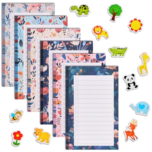 AUAUY 6-pack magnetiska anteckningsblock för kylskåp, blomsterdesign, livsmedelslista, magnetkuddar med 12 st minikylskåpsmagneter, anteckningsblock med full magnet för inköpslista, att göra-lista, 50