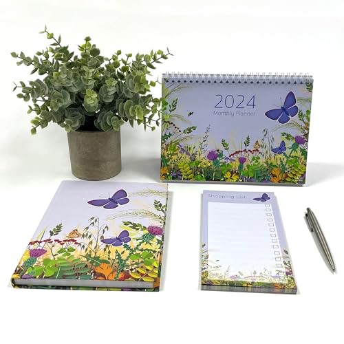Exacompta - Ref GS036Z 2024 Organisationspaket - Innehåller en tidskrift i A5-storlek, skrivbordskalender (månad per visning) och ett anteckningsblock för inköpslista i en fjäril och blomdesign