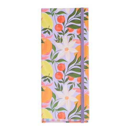 Miquelrius - Uppsättning med klisterlappar, veckoplanerare och inköpslista, 93 x 230 mm, 40 ark 80 g/m², fodrat kartongomslag med gummiförslutning, Happy Fruits-design