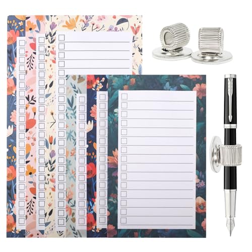 Magnetiskt inköpslista, kylskåpsklämma, 4-pack med 1 elastisk pennklämma, 200 st uttagbart magnetiskt lås för kylskåp med 2 pennor, blomtema för
