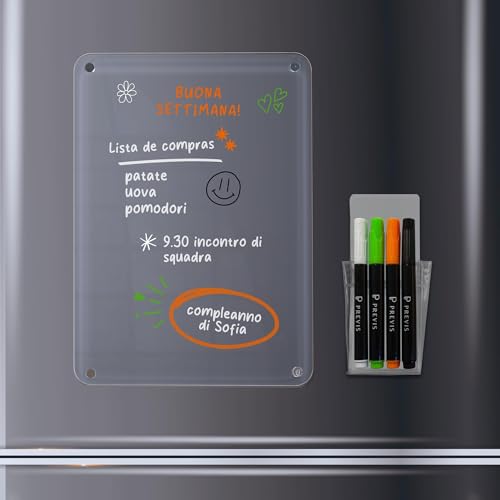 PREVIS A4 transparent kylskåpstavla för att skriva ner uppgifter, meny, inköpslista - 4 levande färgpennor, magnethållare - Board Iman kylskåp för organisering
