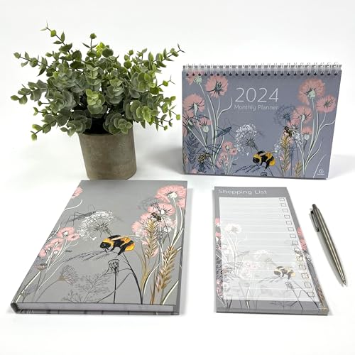 Exacompta - Ref GS035Z 2024 Organisationspaket - Innehåller en tidskrift i A5-storlek, skrivbordskalender (månad per visning) och ett anteckningsblock för inköpslista i ett bi- och blomsterdesign