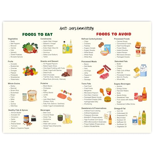 Anti-inflammatorisk matguide affisch - 30 x 40 cm näringsdiagram för hälsosamt ätande, antiinflammatorisk kost väggkonst, inköpslista och konverteringstabell för köksdekor, inflammation som minskar