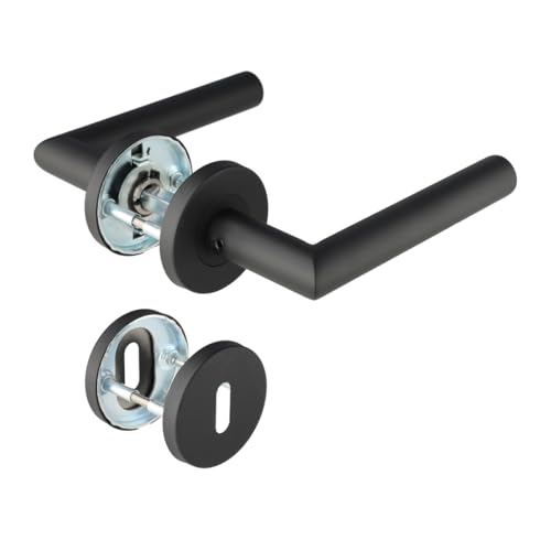 Aperit svart dörrhandtag i rostfritt stål – svart dörrhandtag professionell dörrbeslag T-modell – EN1906 klass 3 – dörrhandtag par med toalettlås – handtag/dörrhandtag för innerdörrar, rund