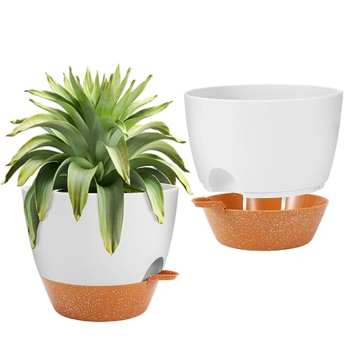 GARDIFE 25 cm växtkrukor, självvattnande krukor, 2-pack blomkrukor, stora plastplanterare med djup reservior och höga dräneringshål för inomhus utomhusväxter och blommor, vit