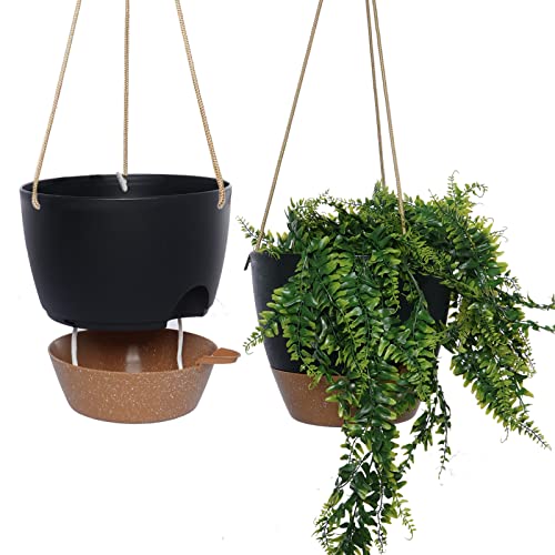 SwinDuck 25 cm självvattnande hängande krukor, 2-pack hängande planterare med 40 oz djup behållare för inomhus utomhusväxter, blommor, svart med brun