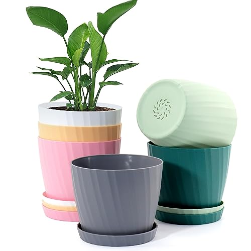 UOUZ Växtkrukor i bulk, 6-pack plastplanterare med dräneringshål och fat, för inomhus-, utomhusväxter och blommor, 15 cm, färgglad