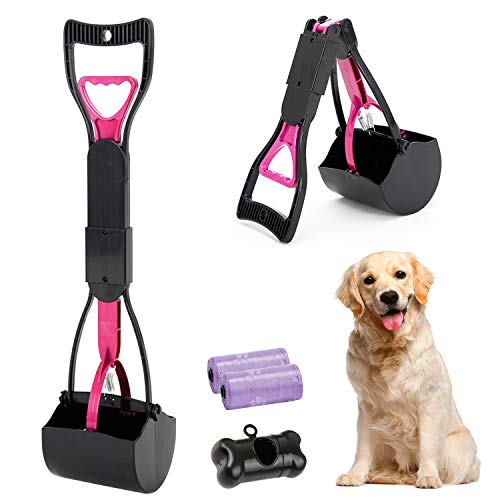 HyAdierTech Hundbajsplockare med långt handtag, 61 cm (24 tum), vikbar, bärbar, med solida tänder, plockar upp ditt husdjurs avföring utomhus/inomhus, perfekt för katt- och hundbajs (rosa)