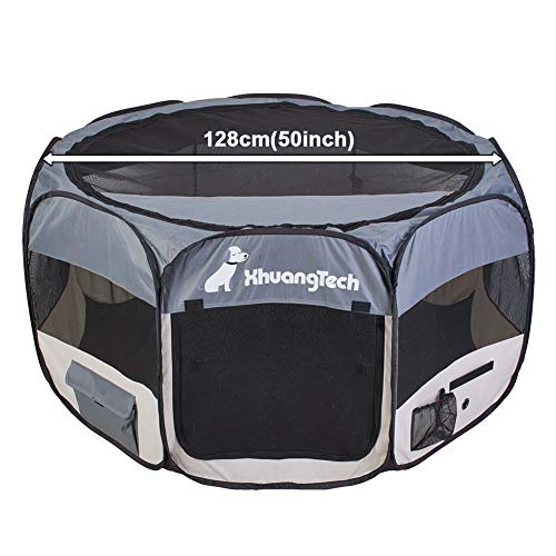XhuangTech Mjukt tyg bärbar hopfällbar husdjur hund katt valp lekhage, inomhus/utomhusbruk husdjur kennelbur 128 x 128 x 68 cm (grå)