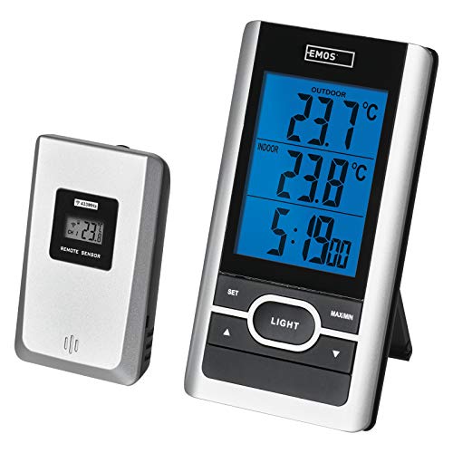 EMOS E0107 Trådlös digital utomhus- och inomhustermometer med utomhussensor och minnesfunktion, batteridriven, plast, svart, grå