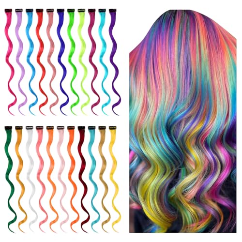 Aomig 22pcs FäRgat HåRföRläNgning, 20 Tums FäRgglada LåNga VåGigt HåR Peruk FöR Barn, Flickor, Kvinnor, RegnbåGsfest-Frisyr, HåRföRläNgningar, Klippfest, HöJdpunkter, TillbehöR FöR Fest HåR Inredning