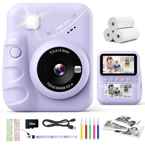 Barnkamera Instant Print, 1080p Instant Camera för Barn med 2,4 Tum Skärm, Selfie Digitala Videokameror för SmåBarn, Julfödelsedagspresenter för Barn (Purpur)