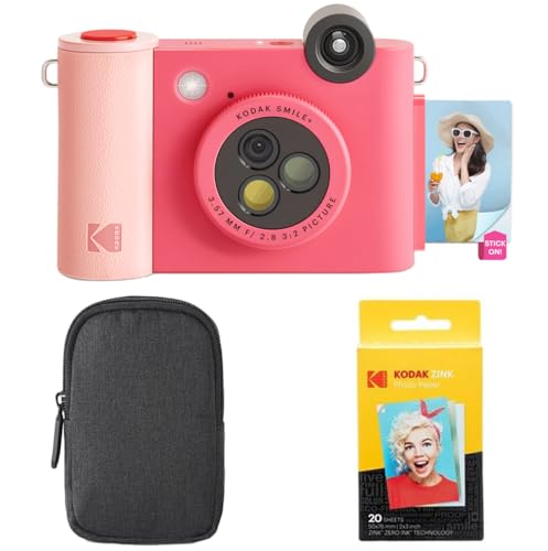 KODAK Smile+ 2-in-1 Digital Instant Camera & Photo Printer Starter Bundle - Case + Zink 20pk Paper - 10MP, Rotating Lens - Pink