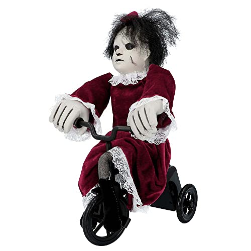 Boland 73048 - Interaktiv skräckdocka på cykel, storlek 35 x 21 cm, Angry Mathilde, läskig docka med ljud och rörelse, dekoration, dekorativt objekt, halloween, karneval, temafest