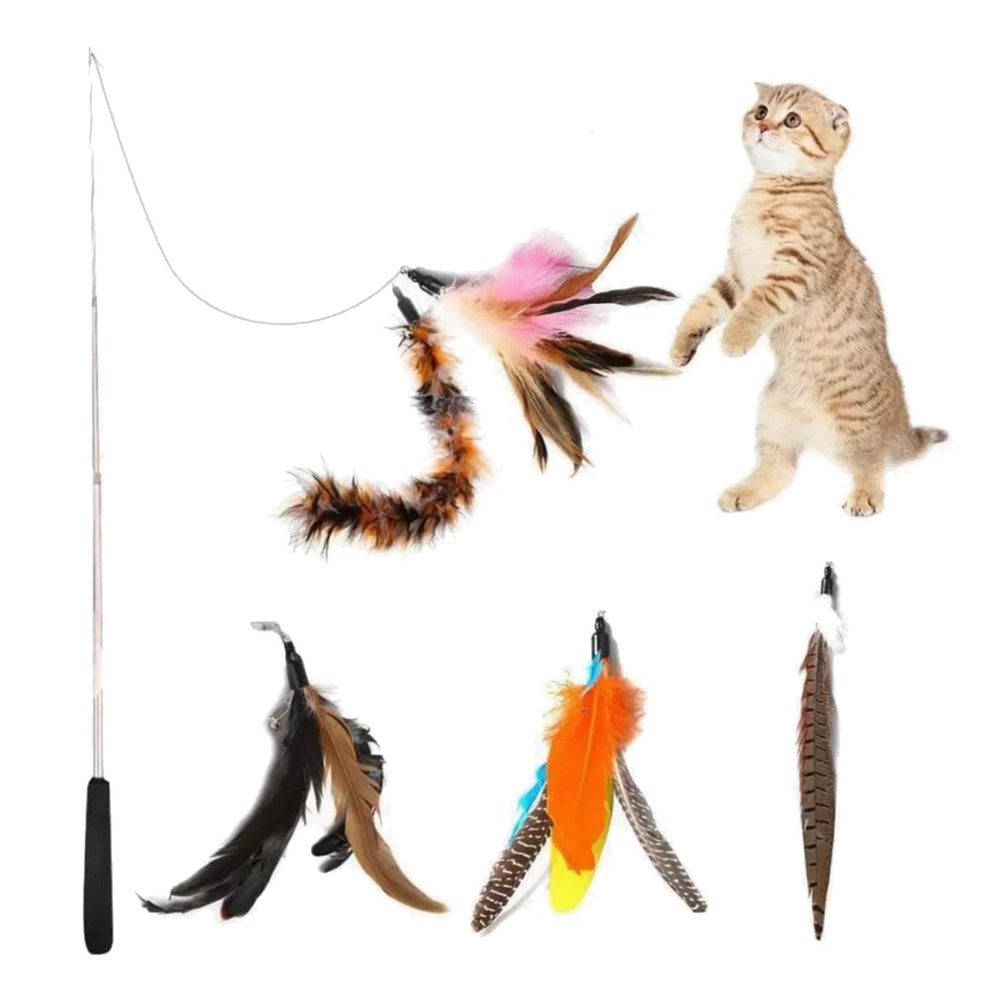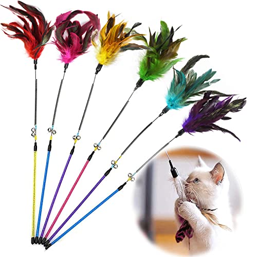 MAIYADUO Kattleksak med kattfjäderspö och kattleksak, interaktiv leksak, fjäderstav med klocka, 5 x naturliga fjäderpåfyllningar